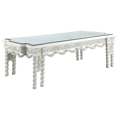 Sophisticated luxury radiates beautifully in the Vanaheim Dining Room Collection. Fabulous floral design with gorgeous details in each piece makes the collection classical and timeless. Antique white finish gives the surface an alluring feel and elegant touch. A clear glass dining table top allows light to filter into and through the whole table, enhancing the collection’s overall design. Upholstery side chairs feature elaborate button-tufted design for adding extra style and comfort to the collection. This extremely extravagant style will make any ordinary dining room appear much more unique.