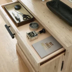 Different is good. Bring modern design into your home with this lateral file from the Anda Norr® collection. This 2 drawer lateral file cabinet is designed with a durable, spacious, 1″ thick top for gallery type display of office supplies, photos of your family, and the perfect accent lamp. This wood lateral file cabinet includes two drawers with full extension slides that hold your letter or legal size hanging files. With safety in mind, this modern file cabinet includes an interlocking safety mechanism that allows only one drawer to open at a time. This mixed materials file cabinet is rounded out with a powder coated metal base and leather pulls on the drawer fronts to complement the woodgrain and white accents. Finished on all sides for versatile placement in any room of your home, this wood file cabinet will look polished from every angle. With a Sky Oak® finish with White accents, this lateral file cabinet is the perfect touch of modernity to spice up your home office.