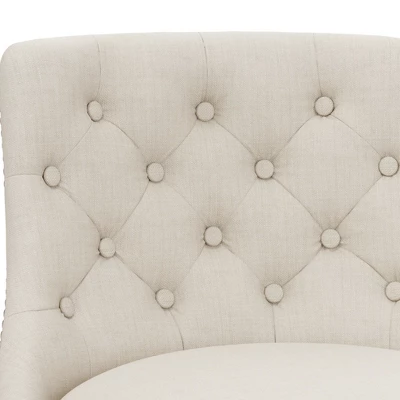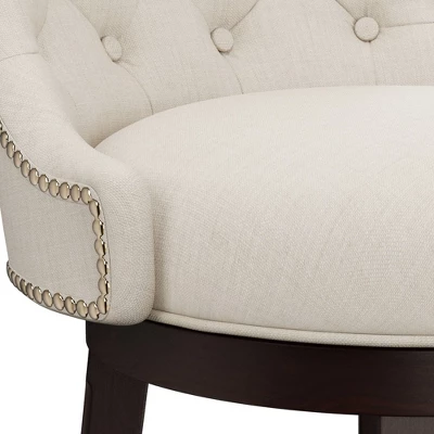 Is it a bar stool? Is it your favorite cozy chair? With this Wooden Counter Height Stool, you can have both! The sturdy chocolate wood base of this stool supports a beautifully designed 360-degree swivel chair in a subtle cream fabric that feels like it could live in any room of your home. And with its low English arm style, button tufted back, and shiny nickel nailhead trim along the edges, this traditional bar stool manages to offer a touch of modern flair and sophistication for any design scheme. So, go ahead—grab your tea, grab a book, and grab a seat. Assembly required.