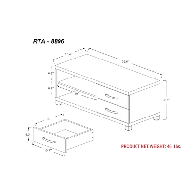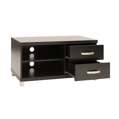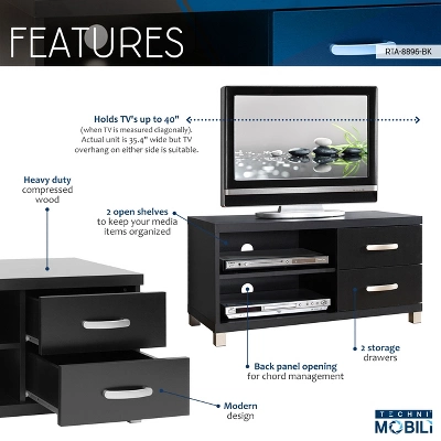 This modern Techni Mobili TV cabinet, for TVs up to 40″, is designed to fit any bedroom or family room. It includes two drawers and 2 shelves for storing electronics and gaming accessories. Shelves have a back panel with openings for cable management. The TV stand is made of heavy duty compressed wood and laminate surface that is resistant to scratches. Important: Holds TV’s up to 40″ when TV is measure diagonally. Actual unit is 35.6″ wide but TV overhang on either side is suitable. Color: Black
