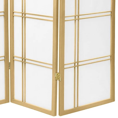 Bring home some glamorous class with this Tall Double Cross Shoji Screen in gold from Oriental Furniture. This three-panel shoji screen is the perfect solution, whether you want to separate your bed from your living space in a studio apartment or you want to tuck away a reading corner. Made of hardwood and metal, this screen makes for a durable divider and can be arranged however you like.