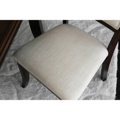 Create a sophisticated yet casual dining experience in a traditional dining room with the Bristol Wood 7-piece Dining Set. A spacious tabletop seats up to six family members and guests effortlessly. Curved legs and a rectangular shape present a sleek understated touch. Each of the six dining chairs feature curved tapered legs for a modern flair. Padded seats and backs wrapped in a light cream tone fabric offer a striking contrast against the rich cherry tone of the solid wood frame.