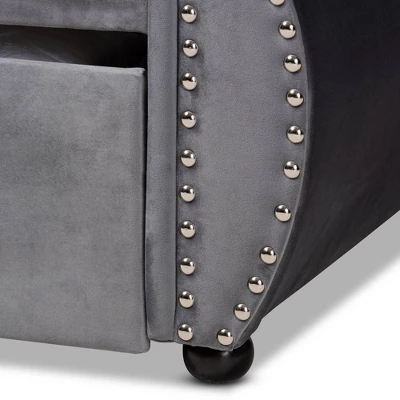 Lounge and sleep in glamorous style with the Abbie daybed. This versatile piece is made in Malaysia and fitted with a pull-out trundle to provide convenient accommodation for overnight guests. Its sturdy wooden frame is padded in foam and upholstered in a soft, sumptuous velvet fabric that provides ample comfort for resting. The Abbie daybed requires assembly and brings a classy touch to the modern bedroom or guest room. Crystal tufting adds charm, while silver metal nailheads accentuate the sweeping curves that define the elegant silhouette. Dimensions: 41.73″ High x 93.7″ Wide x 57.87″ Deep; Arms: 32.28″ High; Trundle: 76.77″ Wide x 40.94″ Deep x 11.42″ High; Trundle Maximum Mattress Height: 7.87″ High; Inside Dimensions (Mattress Size): 54″ Wide x 74″ Deep