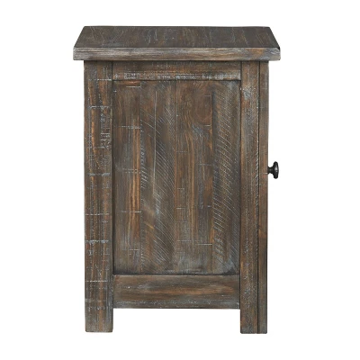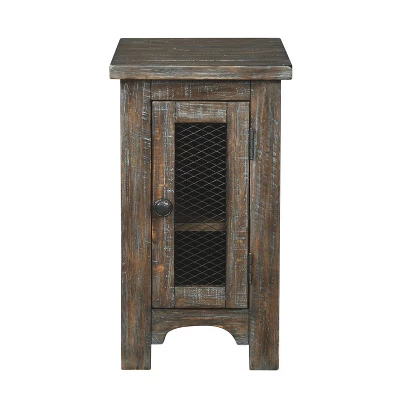 The Danell Ridge chairside end table is so much better for the wear. Its clean, straightforward profile is enriched with solid pine wood treated to a complex finish melding gray and brown hues. Cabinet door with wire mesh front infuses a farmhouse fresh element that’s right on trend. Talk about loaded with charm and packed with possibilities. Signature Design by Ashley is a registered trademark of Ashley Furniture Industries, Inc.