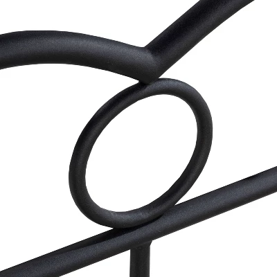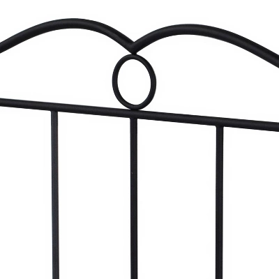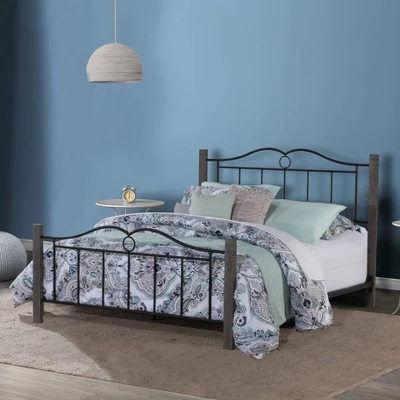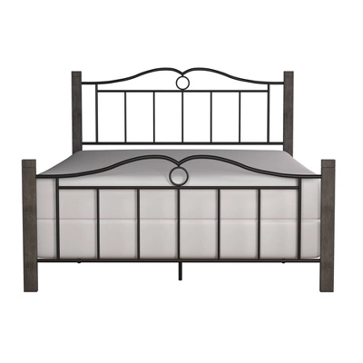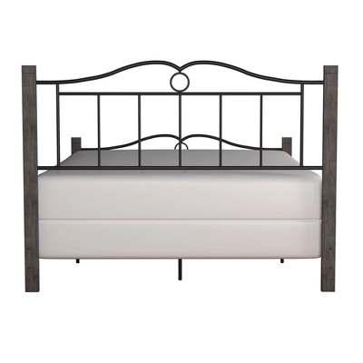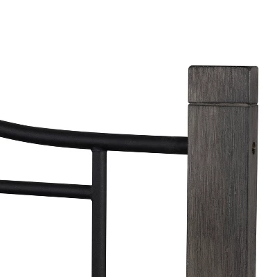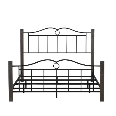 Bring a touch of elegance to your bedroom with this contemporary metal frame bed. Graceful double arched design on both foot and headboard with center motif mixed with a simple spindle design fuse to make this bed a stately piece. A combination of black metal and brushed charcoal finished wood posts creates an aesthetic that’s ideal in lodge and rustic décor schemes. This bed set includes everything you need in one box: headboard, footboard, and metal slat support system. Mattress and box spring required; not included. Assembly required.