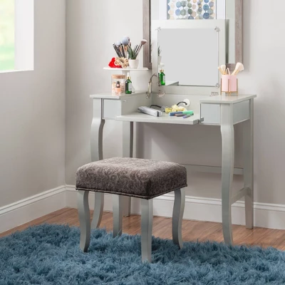 Glamorous in design and style, the Harper Vanity Set is perfect for adding to a bedroom or dressing area. The vanity has an eye-catching silver finish accented by a mirror front and sides. The middle of the vanity top lifts to reveal hidden storage space. Decorative curvy front legs complete the design. A matching stool is upholstered in a pewter gray fabric.