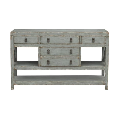Tapping a bit of hometown nostalgia, the simple yet sophisticated style of this credenza combines open shelving with X design details and five spacious drawers. The Bexley Vintage Green finish and dark metal pulls emphasize the rustic farm-to-décor feel that makes this a perfect addition for your kitchen or breakfast nook.