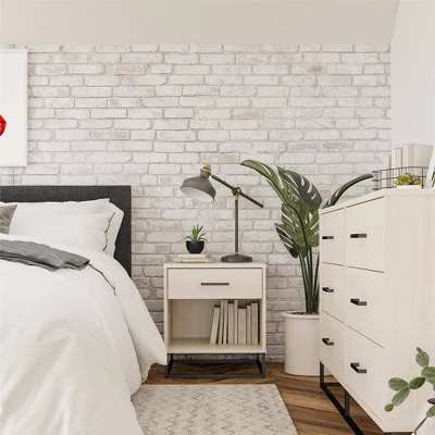 Upgrade your master bedroom or guest room with the Novogratz Kelly Nightstand. Keep your alarm clock, cellphone, and other nighttime essentials on the top surface to have everything you need for some shut eye within reach. The drawer can store away smaller items that you want to keep out of sight, and there is a lower open storage cubby. Made of laminated particleboard with a powder-coated metal base, the off-white woodgrain finish pairs with the metal base and hardware for a trendy look.