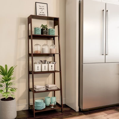 The Set of Two 5-Tier Leaning Book Shelves by Lavish Home is perfect for all your decorating and storage needs. Use these shelves for living room décor, kitchen storage, or to give your home a spa-like feel by using them as bathroom shelves to display fluffy towels and toiletries. Constructed of dark brown painted manufactured wood, each book shelf features a straight back for added stability when placed against a wall and a descending angled design for a space-saving footprint in any room, large or small. Five 22-inch-wide shelves provide ample space to organize and neatly display your belongings, while the sleek look will add functional style to any room of your home for years to come.