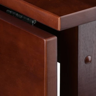 Make a functional and timeless addition to your home with this Lynnwood Drop-Leaf High Table from Winsome. Made from a sturdy wooden frame with a charming walnut finish, this rectangular bar-height table features straight leg supports for simple style that will look great in your space. The drop-leaf design provides extra serving or seating room while making this wood dining table perfect for even small areas in your kitchen or dining room. Top table area when leaf is up 39.37″W x 30″D x 35.43″H. Table when leaf is folded 39.37″W x 20.70″D x 35.43″H. Drop leaf 39.37″W x 10.31″D. Constructed in solid wood in warm Antique Walnut Finish. Ready to Assemble.