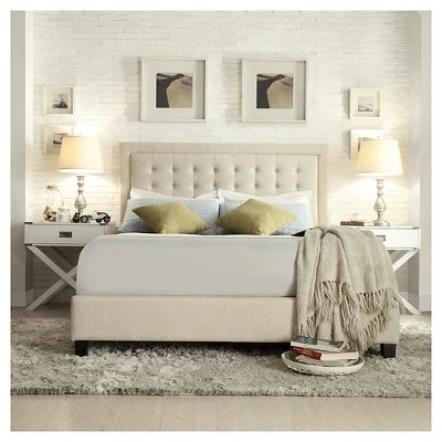 A traditional look with a contemporary twist, the Hudson Button-Tufted Platform Bed from Inspire Q is a gorgeous addition to your room decor. The perfect neutral focal point, this upholstered platform bed constructed with soft linen includes a button-tufted headboard and fully upholstered rails for a cohesive look. Its sturdy platform slats will support your mattress without the use of a box spring for a clean, low-profile look.