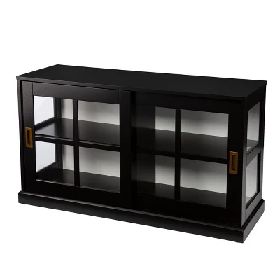 Versatile storage comes home with the Aiden Lane Santales Curio Cabinet. Sliding doors tuck away collectibles or knickknacks, while the sleek black finish keeps your space feeling chic and modern. Slide this multipurpose cabinet into your dining space to keep china and flatware close at hand, or station in your living area to organize movies and books. Put clutter in its place when you add this two-tone curio cabinet to your entryway, den, or open concept living space.