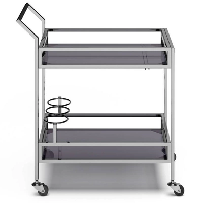 Sleek and glamorous Snell Bar Cart is at your service. The cart’s stainless-steel chrome frame rolls about on a set of four wheels, serving food and drink with style. Featuring a top and bottom shelf that is made of grey smoked tempered glass and plenty of storage for wine bottles and stemware. This beautiful and well-crafted cart is perfect for your entertaining and storage needs.