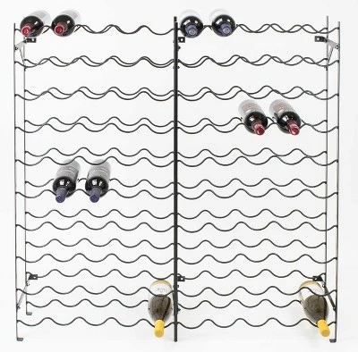 - STURDY DESIGN — Made of sturdy metal construction with smooth black finish — Features rows of scallop/wave shaped shelves — Solid structure prevents wobbling, tilting, or falling — Holds most standard wine bottles — Wine Bottles NOT INCLUDED