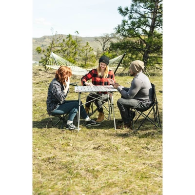 Our foldable aluminum slat table marries extreme portability with durability. The aluminum slats that compose the surface of the table roll up into a compact package. After set-up, a metal X-frame provides extra stability to support loads of up to 65 lbs! Our compartmentalized carry bag makes it easy to stay organized while you’re carrying this table to your favorite wilderness retreat.
