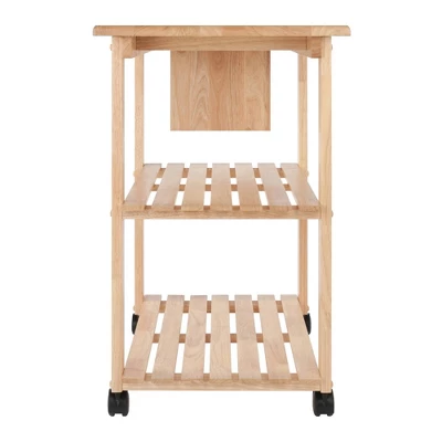 This utility cart has a pullout cutting board for chopping and slicing. It also has an integrated knife rack for keeping all your tools handy. Plus, it has 2 plank-style shelves for placing extra cutlery or vegetables. The 2-shelf utility cart has a side towel bar for keeping kitchen towels within reach. The locking casters keep the cart from unnecessary movement. This rolling utility cart is made of hardwood and has a natural satin finish. The wood utility cart can be wiped clean with damp cloth.