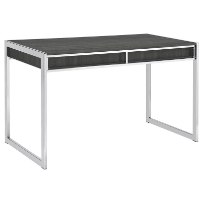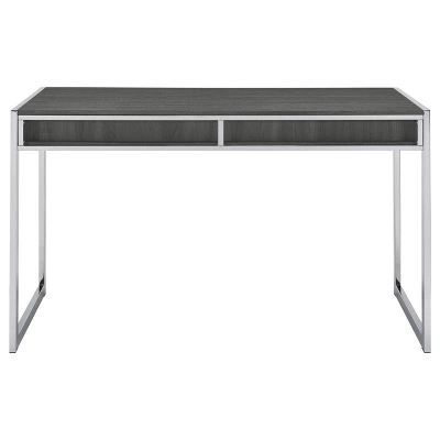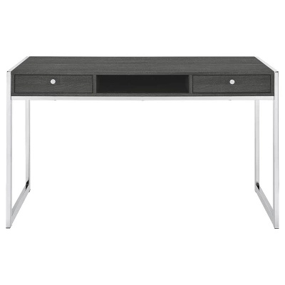 Built with just the basics, this writing desk delivers cool, stylish sophistication. Minimalist design elements add a refreshing touch for a space that gravitates toward modern. With a weathered gray finish desk unit, it brings a cool, neutral palette. Take advantage of an open center compartment between two drawers with full extension glides. Steel square frames on each side offer a balanced look.
